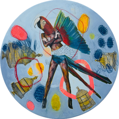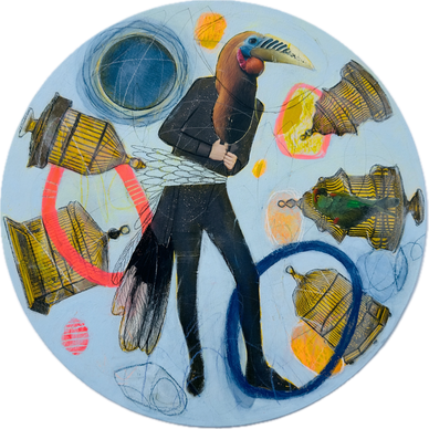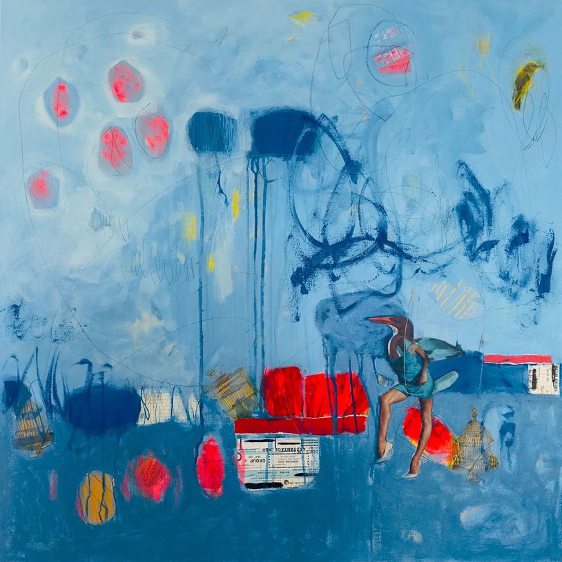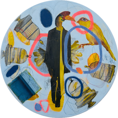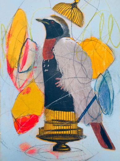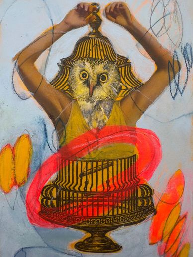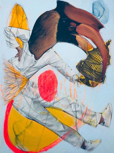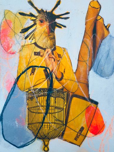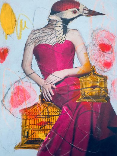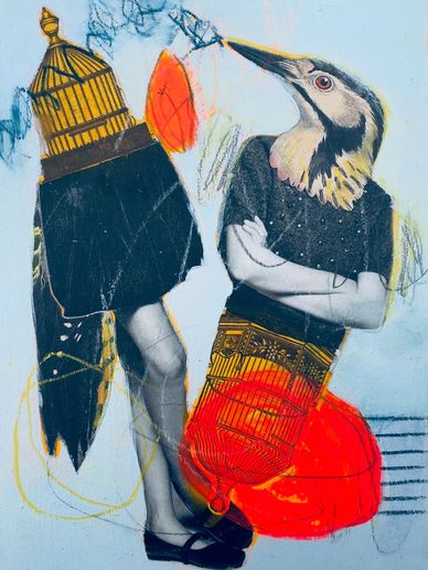 Silent Migration is a striking visual narrative that unearths the complex interplay between freedom and constraint, identity and societal expectation. Through a fusion of collage, painting, and abstraction, this series presents a surreal yet deeply symbolic universe where women are depicted as bird-headed figures navigating a landscape of cages—both real and metaphorical.